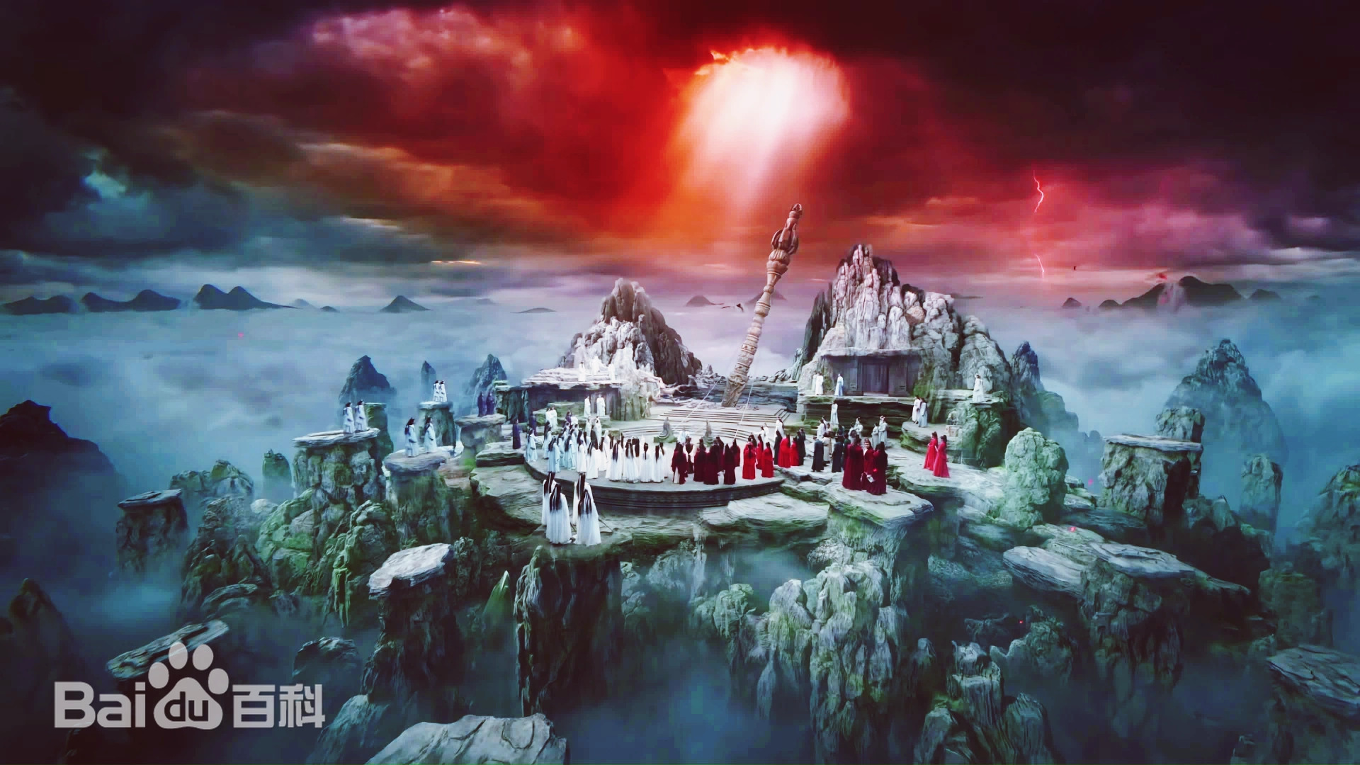 Cảnh trong phim “Trường nguyệt tẫn minh”. Cây như cây kích cắm trên đàn giữa hai mỏm đá cũng là hàng ma xử, dùng để trấn áp yêu ma.
